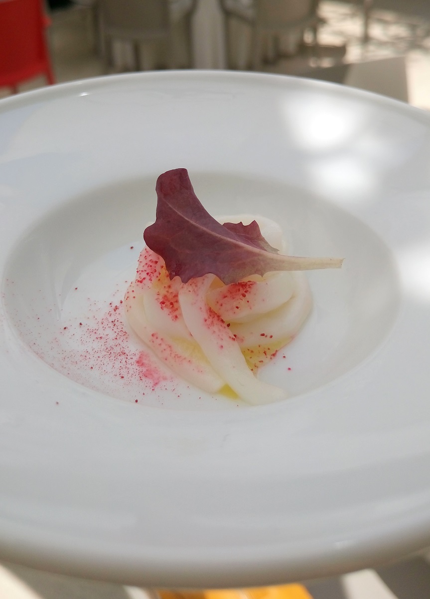 - Benvenuto con tartare di tonno, tataki di manzo, linguina aromatizzata al limone e zenzero, spaghetti di calamaro con polvere di lampone.