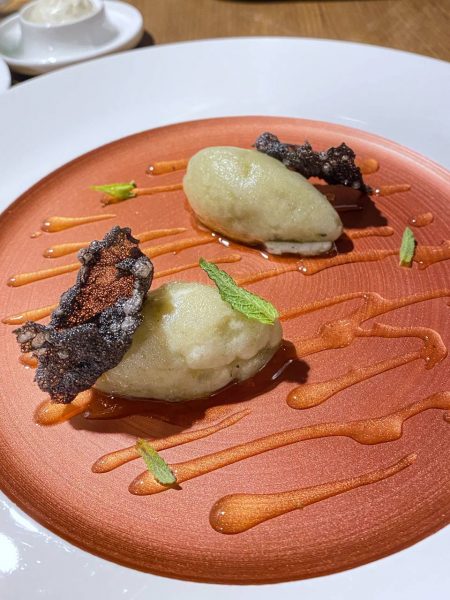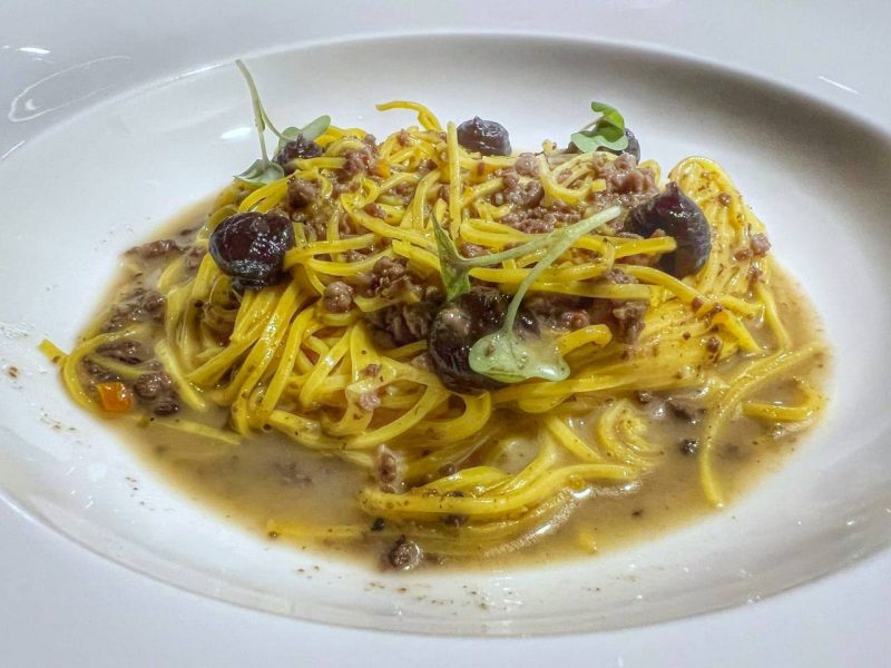 Il Risotto burro e alici è un piatto dal gusto deciso e pieno. Il riso è mantecato con lo Smen: burro fermentato tipico del Marocco dal gusto intenso che ricorda il percorino. A completare emulsione di alici, alici e spruzzata di garum. Segue il Tubetto Cozze e bergamotto. Le cozze ghiacciate si sciolgono a contatto con il calore della pasta e del piatto liberando tutti i profumi. Poi Tagliolini, ragù di cinghiale e mela ossidata piatto goloso che cerca sponde sapide e fresche a compensarne la dolcezza.