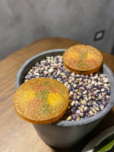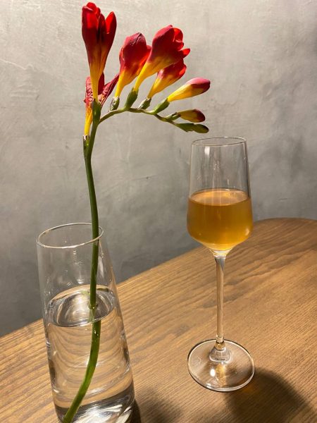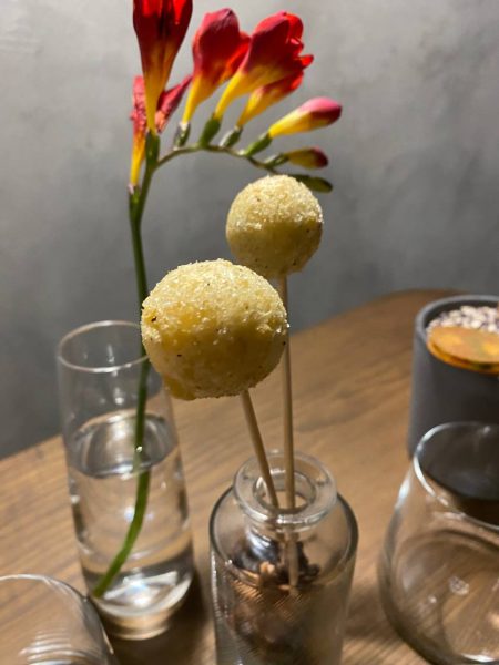 Fiori freschi a tavola e si parte con un bicchiere di Kombucha per preparare il palato, arrivano poi in sequenza tre aperitivi: Chips di cotica di maiale e salsa barbeque, Sandwich di melanzana con salse al parmigiano, basilico e pomodoro. Lollipop di formaggio e rosmarino. Tutto tecnicamente ben fatto e con una piena riconoscibilità degli ingredienti. I taralli sugna e mandorle con i grissini meritano sicuramente il bis, accompagnati dalla spuma di sugna sono una goduria a forte impatto goloso. Buonissimo il pane.