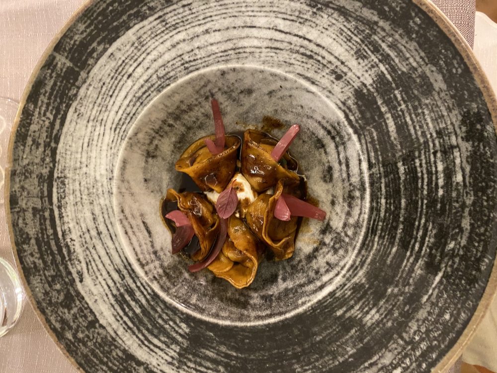 L’antipasto di Quaglia lardellata con maiale nero, ciliegie fermentate e blu di Capra, e il primo piatto di Cappellacci di coniglio, lattica e cipolla rossa, con il perfetto spessore della sfoglia, sono stati preparati da Gianluca.