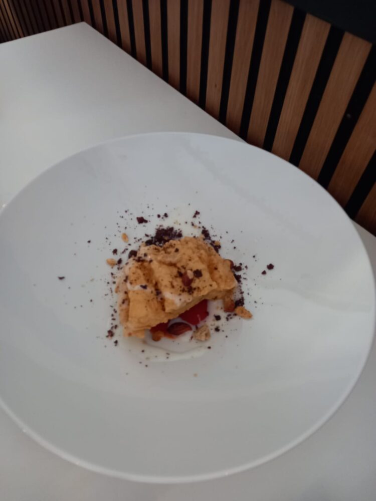 Bagaglio che gli consente di dare il meglio di sé in un piatto come il baccalà dorato e fritto, servito assieme alla marmellata di pomodoro del piennolo, salsa all’aglio, crumble di tarallo sugna e pepe e cenere di olive. Il primo è uno spaghettone cacio e pepe con tartare di gambero e lime, dal sapore morbido ed avvolgente.