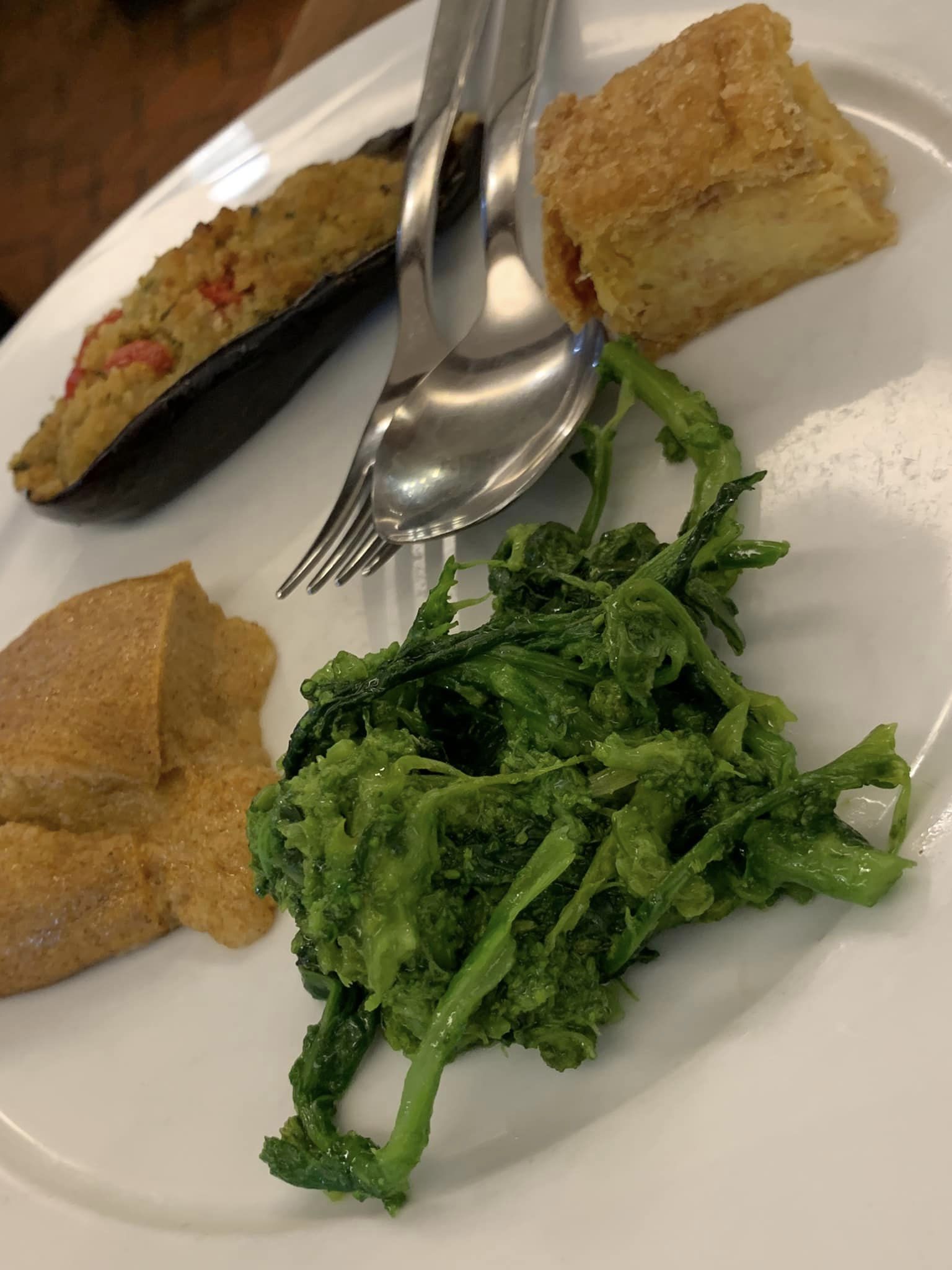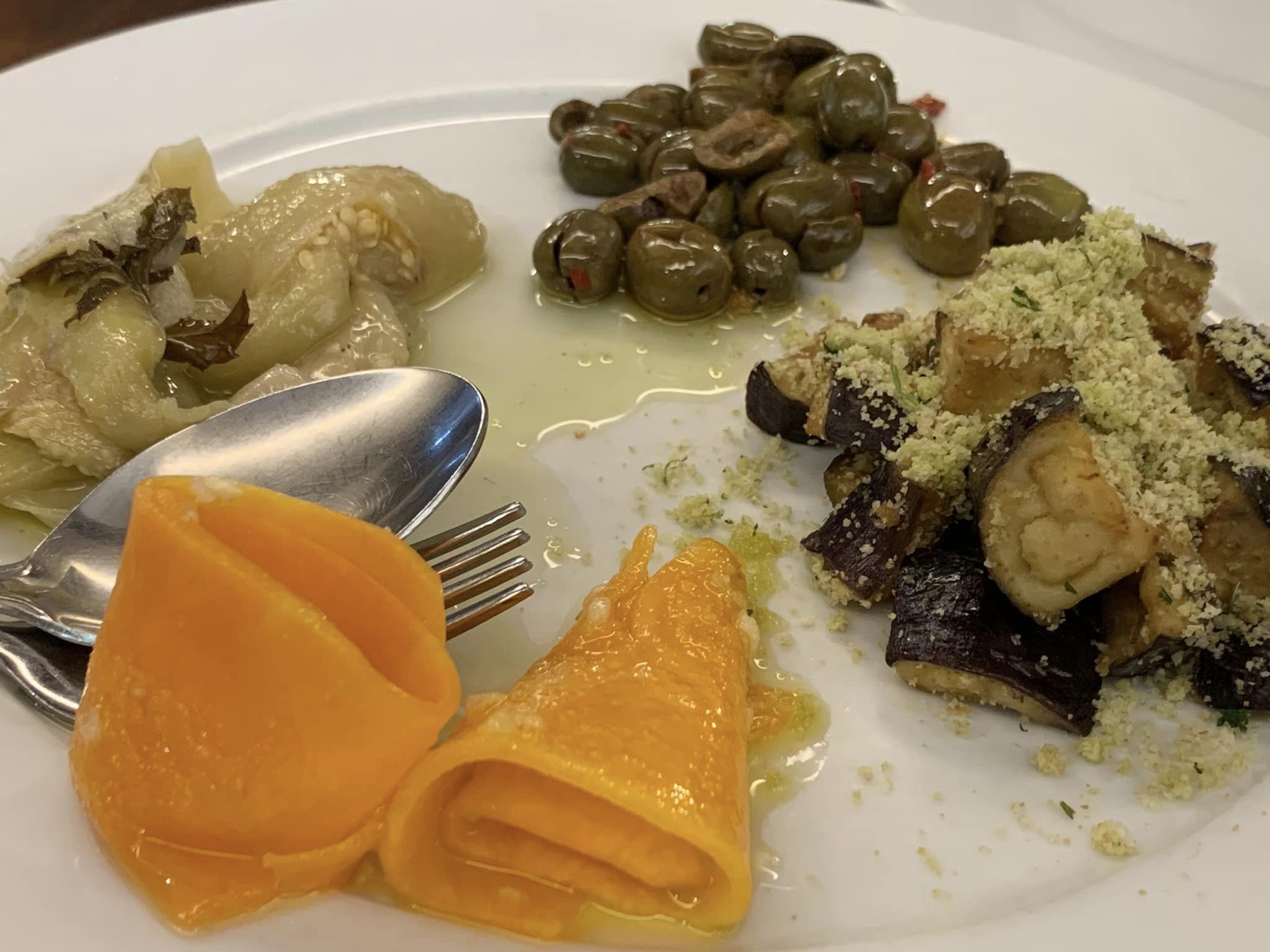 I vegetariani o, più semplicemente, gli amanti dei piatti vegetali avranno di che divertirsi: una delle specialità sempre in carta è il grande antipasto di verdure crude e cotte (20 euro, consigliamo di dividerlo in 2) che varia a seconda delle stagioni. A noi è toccata una bella varietà grazie agli ortaggi che ancora resistono al tempo, come le ultime melanzane, fritte e ammollicate, ripiene al forno oppure sott’aceto, buonissime.