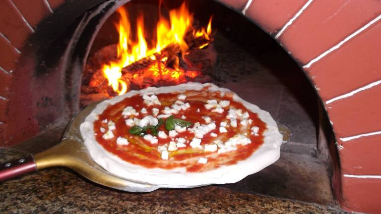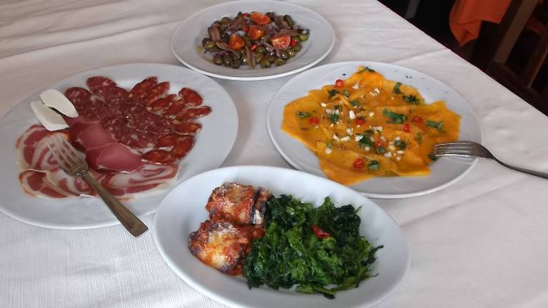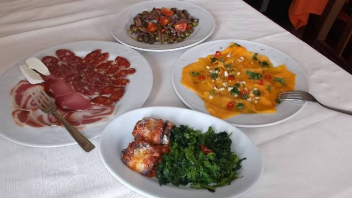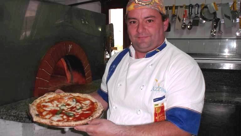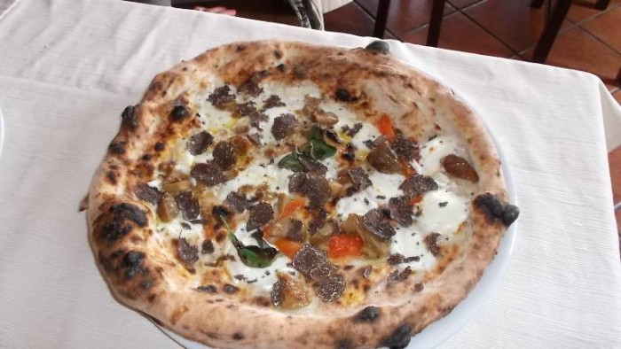 E questo è proprio quello che capita alla Pizzeria Osteria La Pietra Azzurra, attiva dal 1997 e che si fregia del marchio “Verace Pizza Napoletana Stg”, dove il titolare Michele Croccia, già campione mondiale della pizza napoletana nonché istruttore della Scuola Italiana Pizzaioli, si dedica insieme alla sua famiglia alla coltivazione di prodotti ortofrutticoli ed anche all’allevamento di animali domestici. Durante la mia recente visita per gustare le sue famose pizze ho provato un’infinità di antipasti ricchi di tipici salumi locali come la prosciuttella, la soppressata, la salsiccia ed il capicollo, serviti insieme con uno squisito formaggio caprino; e poi zucca marinata all’aceto con olio, aglio e menta; olive denocciolate, con cipolla ed acciughe; melanzane infarinate e fritte e dopo farcite a strati con prosciutto cotto e formaggio e coperte di salsa di pomodoro per essere infornate; e broccoli scuppettiati con olio, aglio e peperoncino. Tre primi piatti, tutti fatti con pasta tirata a mano: ravioli all’uovo, ripieni di ricotta e spinaci e conditi con salsa di pomodoro; cavatielli con provola affumicata e pomodoro; e tagliatelle ai funghi porcini; per secondo l’agnello di Casaletto Spartano cotto alla brace con contorno di patate fritte; e poi baccalà pastellato e fritto.