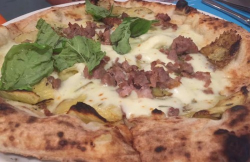 La “Terrona”, pizza molto amata dalla clientela, con fior di latte, salsiccia di suino razza casertana, patate interrate del Taburno al forno con rosmarino e basilico.
