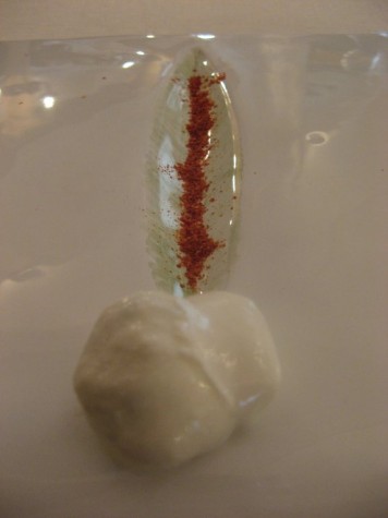 Contemporaneamente si viene dotati di cuffie collegate ad un mp3 che trasmette in maniera divertente ed originale le istruzioni per procedere alla degustazione di Biancadolio, le papille poi riassumono i sapori accompagnate dal canto di cicale. In menù le più svariate interpretazioni della mozzarella di bufala, dall’antipasto al dessert: mozzarella, cozze e latte di mozzarella nera; sfera bianca con ripieno rosso (ai peperoni); palla di mozzarella ( farcita con taglierini al basilico rimozzata impanata e fritta), la mozzarella in crema in frittura e gelato ( tre diverse consistenze e temperature di mozzarella abbinate a confettura di mele annurche); mousse di mozzarella con veli cafoni ( mousse salata di mozzarella accompagnata da una riduzione di liquore alle noci e veli di pane ).