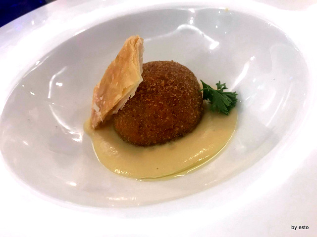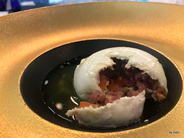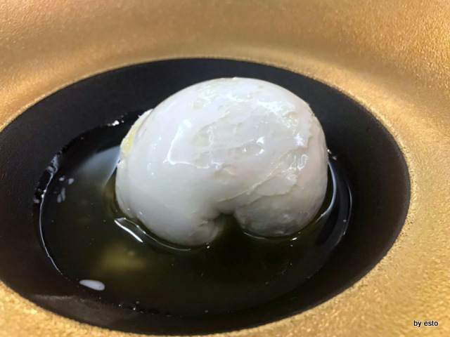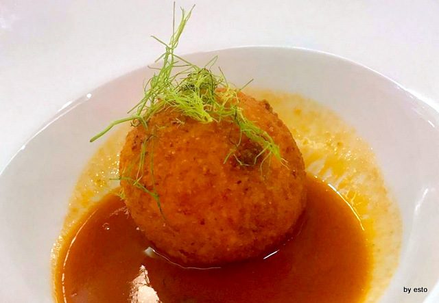 Tra i primi, suggerisco l’assaggio della pasta e patate dove i calamari, le cozze e le patate convivono in armonia con l’aggiunta della fonduta di provola, quindi lo Spaghettone quadrato, aglio, olio e tartare di gamberi, un omaggio alla nonna dello chef.
