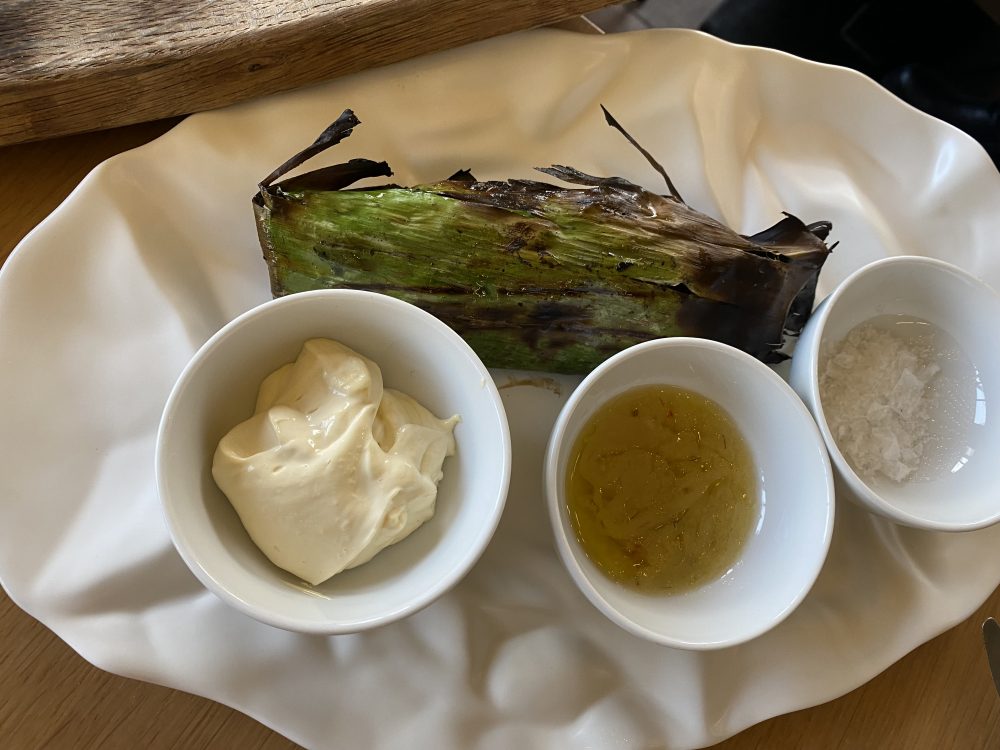 Molto buona è la Ventresca di tonno con i friarielli e la spigola frollata 18 giorni, servita avvolta nelle foglie di banano. Il cestino del pane (preparato in sede) è un richiamo incredibile, mentre l’impasto della focaccia ottenuta con aggiunta di acqua di pomodoro è molto interessante.