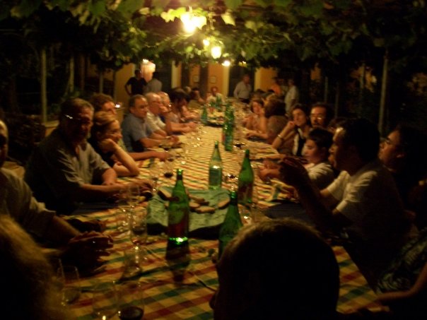 Si è fatta l’ora di sederci alla lunga tavolata sotto la pergola di uva fragola, i piatti preparati da Maurizio Piancastelli, chef di casa, portano in tavola la maestria di un monsù d’altri tempi: piccoli gateau di patate, sformato di peperoni e ricotta, polpettine in agrodolce, ricottine con marmellata di limoni fatta in casa, salame e salsiccia secca di maiale nero casertano insaccato e stagionato da Manuela, panzanella con i pomodori dell’orto, marmellata di cipolle.