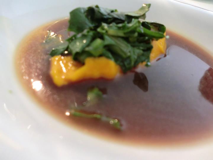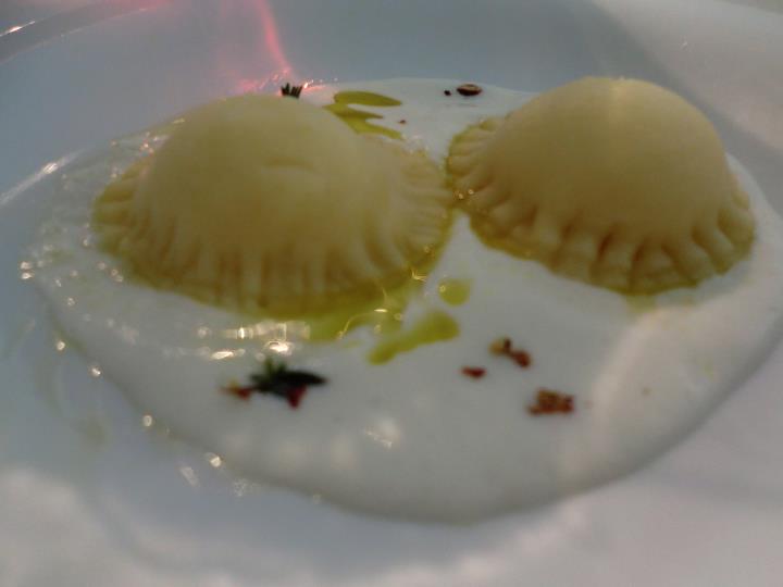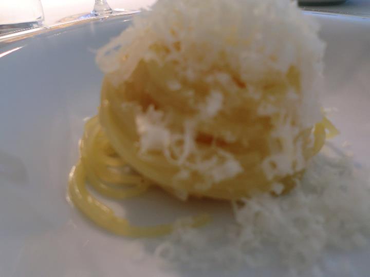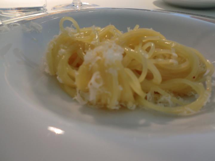 Su questo piatto è stato già detto e scritto tutto. L’assoluto di cipolla è l’idea di cipolla senza l’imperfezione, inevitabile, che ogni cipolla porta con se, come in tutte le cose, si coglie l’idealtipo e lo si ritrova, metallico. Le sfogline di formaggio puntano al consenso attraverso il riequilibrio, ma tutto sommato alla fine surperflue se sei davvero un purista.