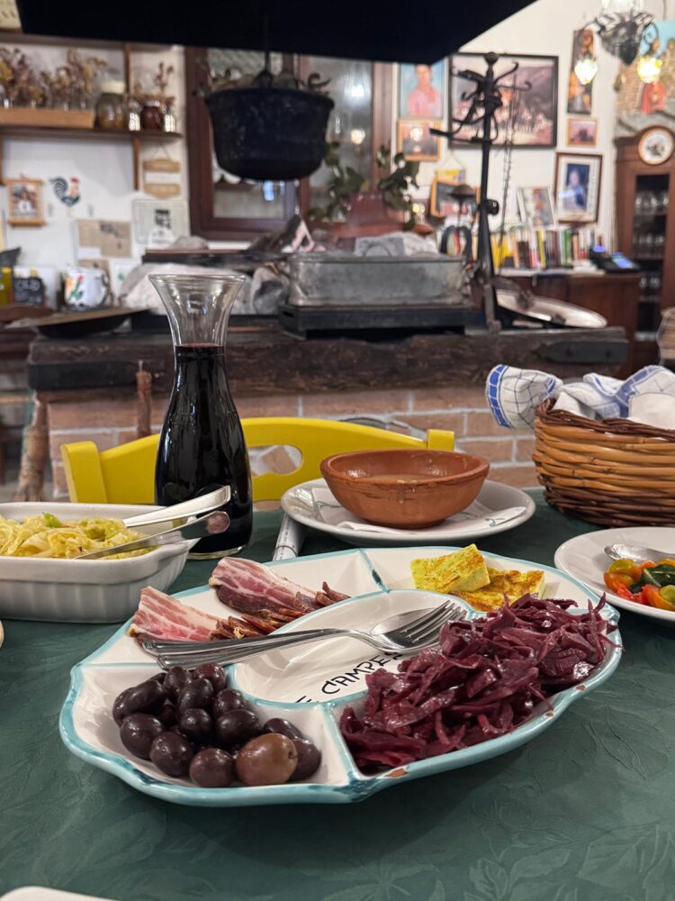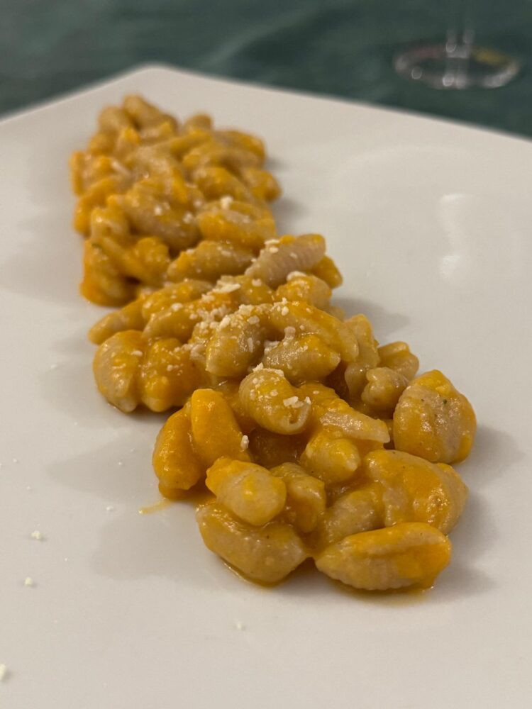 La cucina dell’agriturismo segue la stagionalità ed è fortemente identitaria: piatti di “cucina contadina” come zuppe, legumi, verdure, carni e salumi locali, e preparazioni che riflettono la cultura gastronomica del territorio. Zucca, formaggi, olive, gnocchetti, frittate. Tutto semplice, ma terribilmente saporito.