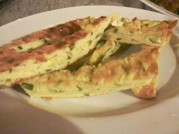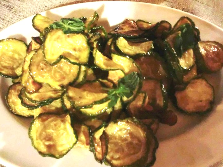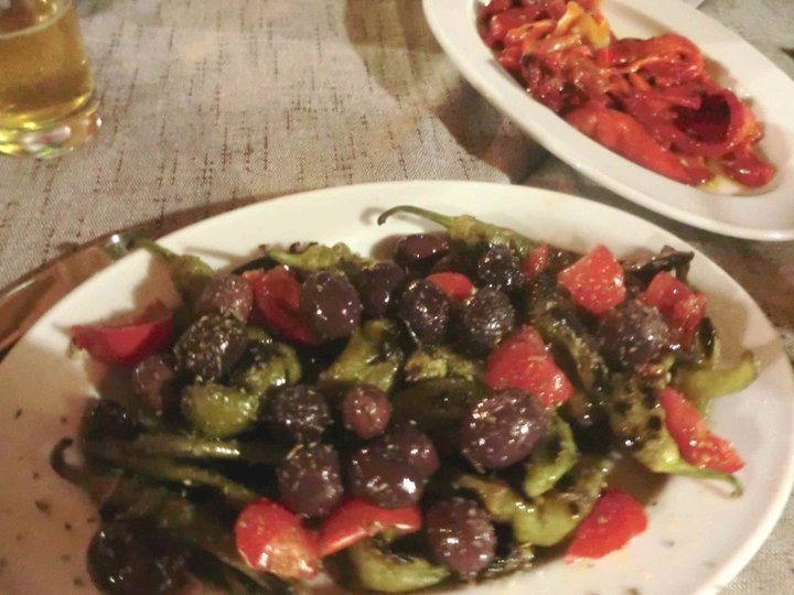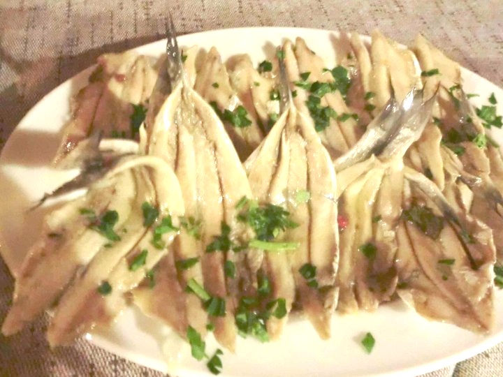 Ma, soprattutto, una signora parmigiana di melanzane, una frittata con zucchine di orto “croccantine”, peperoncini verdi fritti, peperoni arrostiti, zucchine alla scapece. Il tutto accompagnato da una pizza fritta con pomodorini dal sapore e dal profumo indimenticabili e un piatto di alici di menaica (Presidio Slow Food) marinate.