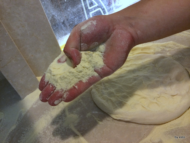 Manipolazione sul banco non disdegnando il rimacinato di semola che non penetra nell’impasto e sfila.