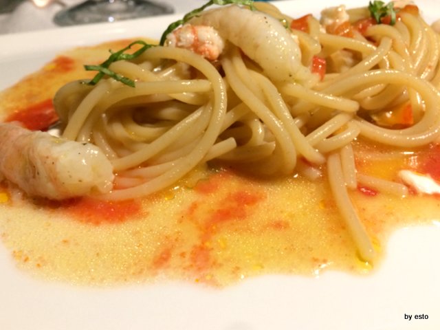 Sciuliariello, per il tipo di maccherone per nulla amidoso, sicché godi della freschezza insolita di questo pomodoro e di quel vago finale piccantino, un millimicron di Bhut Jolokia, che attraversa la dolcezza degli scampi, nonché della burrata.