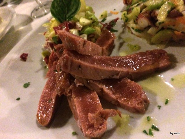 Lo si nota subito gustando gli antipasti: la cottura del tonno è impeccabile e lo lascia umoroso, morbido, tenero; l’insalatina di polpo e seppie è tutta mediterranea così ricca di verdure com’è.