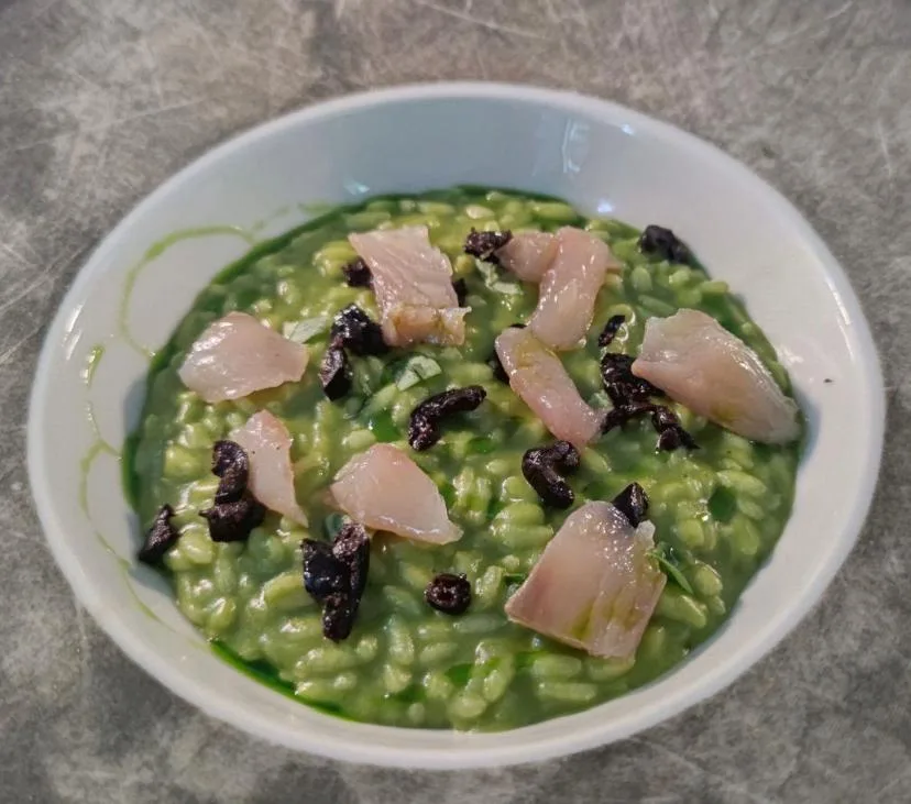 Celestino Mauro-Carnaroli di Sibari, erbe di campo, olive nere e palamita affumicata