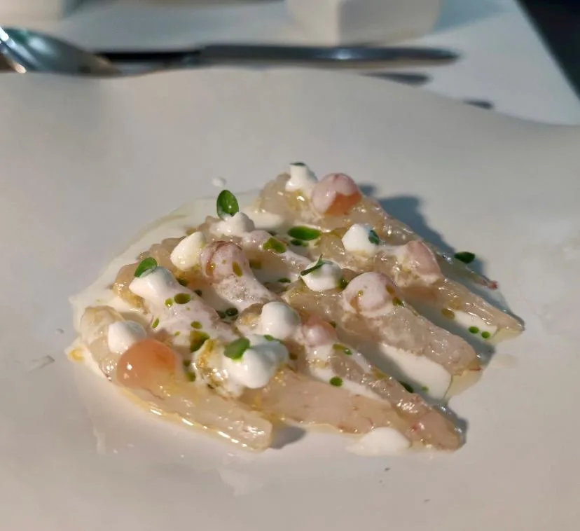 Celestino Mauro-Crudo di gamberi dello Ionio, salsa al burro acido, pompelmo e olio alle erbe