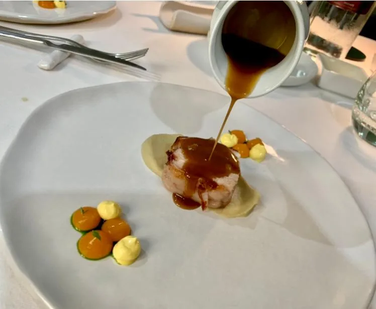 La Ricciola scottata con aglio, capperi e chimichurry “nostrano” rivela invece la mano classica e l’esperienza raggiunta nelle cotture applicata ai sapori e agli ingredienti del territorio. Conferma dell’abilità nelle cotture si ha nella Pancia di maialetto, melanzana “affumicata” e chutney di albicocca, dove l’accostamento degli ingredienti è da manuale.