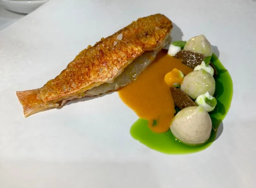 Nel menù estivo, la Triglia con il suo estratto, olive nere, pane e finocchietto selvatico, fonde delicatezza, aromaticità e la freschezza del mare in un unico boccone.