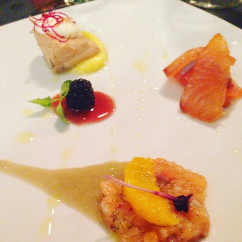 Lo start della serata è dato da una vera e propria rarità, grazie al “Metodo Classico” da sangiovese della Fattoria Poggiopiano. Poco più di 1000 bottiglie, un esperimento, un’idea affascinante ed allo stesso tempo rischiosa in una delle zone nobili del Chianti Classico, dove diciamo la verità la spumantizzazione non è proprio una pratica abituale. In realtà il vino è davvero una sorpresa. Alla vista non limpidissimo non essendo stata fatta ancora la sboccatura, presenta poi una parte olfattiva un po’ timida nel concedersi almeno in prima battuta. In bocca invece la goduria inizia subito, bollicina di carattere, dritta, sferzante, molto piacevole. Vista la straordinarietà della bottiglia anche il piatto non poteva essere da meno, ergo tutti a bocca aperta di fronte ad una variazione di salmone davvero memorabile. Un percorso di crescita professionale dello chef Casotti reso in maniera esplicita dai tre “tipi di lavorazione del pesce” in tartare con gelatina di arancia e finocchio fermentato, “sotto sale e zucchero” con agretto di lamponi e more e come gran finale “infuso e affumicato” con maionese di mango e crema acida allo yogurt.