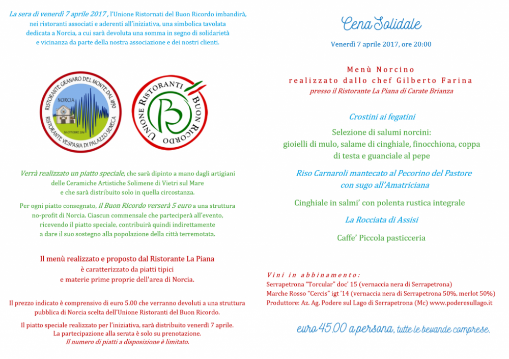 Cena solidale, chef Gilberto Farina |Menù Norcino 17/3/2017 2 MILA LETTURE Cena solidale, chef Gilberto Farina
