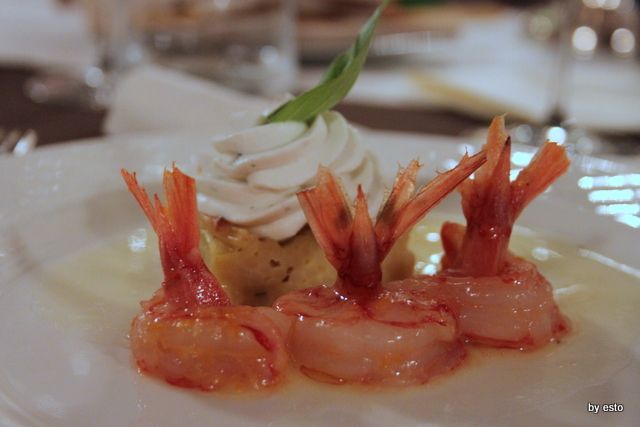 Tapas di pasta, spuma di ricotta di bufala al basilico e gamberi agli agrumi.