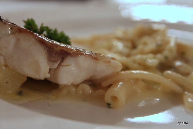 Trancio di pesce su spadellata di pasta e patate e pesto all’aglio croccante