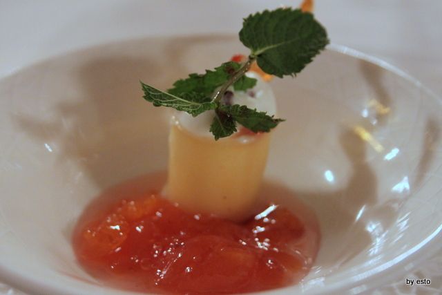 Mezzo pacchero ripieno di cassata napoletana su confettura di pesca gialla e vin brulè