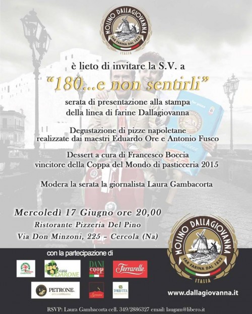 Una storia iniziata nel lontano 1832 a Gragnano Trebbiense, in provincia di Piacenza, quella del Molino Dallagiovanna che mercoledì 17 giugno, alle ore 20,00, presso la Pizzeria del Pino di Cercola (Na) sarà protagonista della serata dal titolo “180…e non sentirli”. L’appuntamento, organizzato dalla giornalista Laura Gambacorta, sarà l’occasione per presentare al pubblico la variegata linea di farine del Molino che spazia dalla pasticceria alla panificazione fino ad arrivare alla pizza napoletana con la nuovissima “LaNapoletana”. Quest’ultima farina, sviluppata dal maestro pizzaiolo Eduardo Ore in collaborazione con gli altri due tecnici del Molino Dallagiovanna, Mattia Masala e Alberto Campagnolo, è stata creata proprio per soddisfare le esigenze specifiche della pizza napoletana.