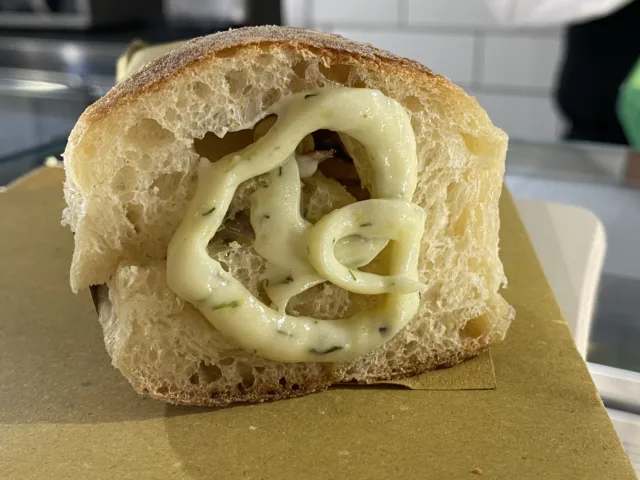 Tipo pane pane quotidiano realizzato con farine di tipo 1 e 2, che ricorda profumi e sapori primordiali, farcito con la preparazione cult dello chef Iavarone e della cucina partenopea: la zuppa forte, servita in questo caso, con lo yogurt che reca una nota di freschezza.