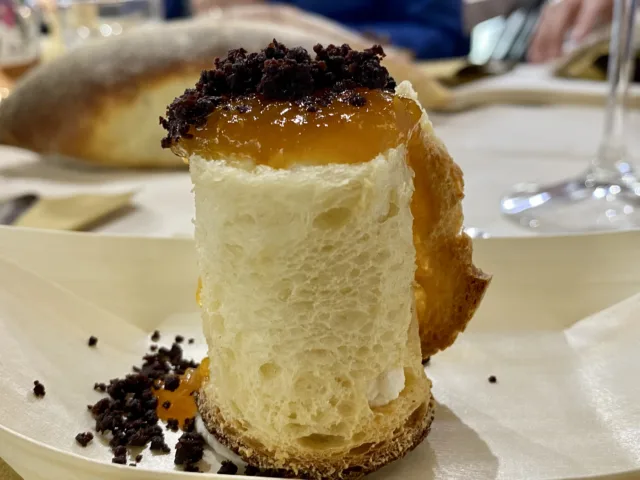 Croissant-salato-con-burrata-affumicata-insalata-di-asparagi-albicocca-del-vesuvio-pomodorino-del-Vesuvio-semi-dry-limone-menta-e-maggiorana