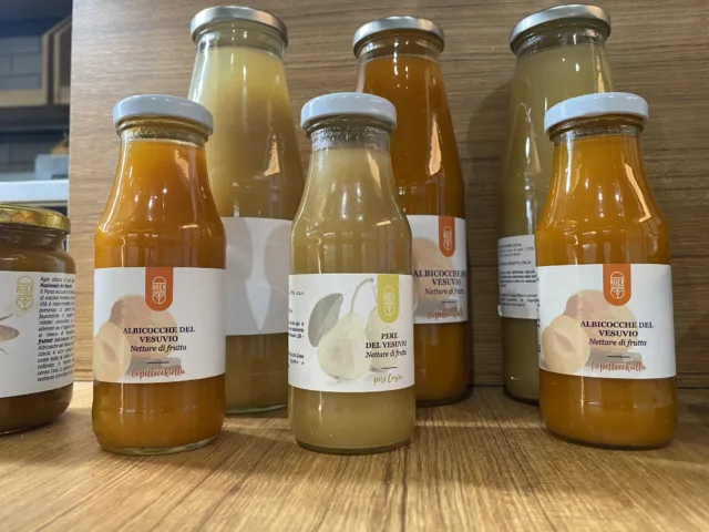 Per il matrimonio per concordanza con il territorio, nei calici, il Pietrafumante 2020, lo spumante Metodo Classico da uve Caprettone della cantina Casa Setaro, e a seguire il Munazei Rosato 2022, da uve Piedirosso in purezza. Per finire, il succo di albicocche del Vesuvio prodotto dall’azienda agricola Ager, in maniera completamente naturale e con l’aggiunta i pochissimo zucchero.