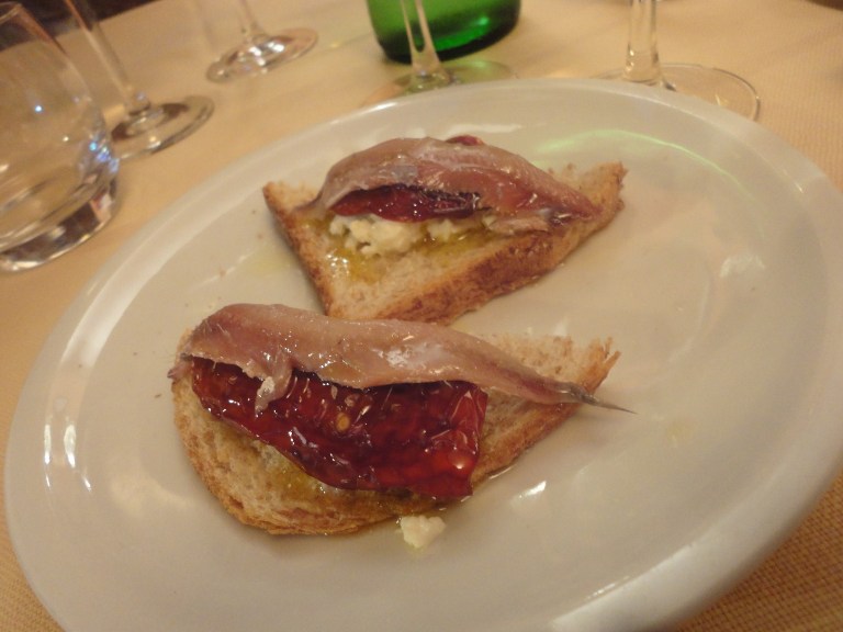 Ma passiamo al menù. Appena seduti, ci arriva un delizioso “amuse bouche” composto da tartine di pane bruno con della stracciatella di mozzarella vaccina dei Monti Lattari, pomodori secchi di Corbara e alici salate di Cetara.