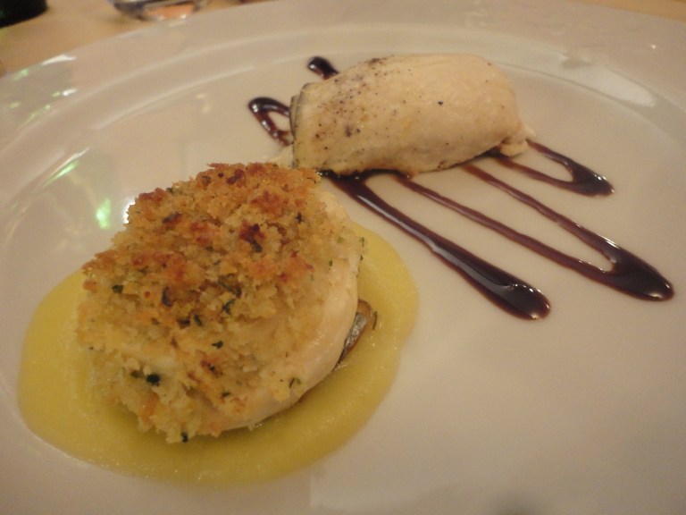 Passiamo ai secondi… Medaglione di pesce bandiera condito con del pane profumato allo sfusato amalfitano su una vellutata di porri e patate e un involtino di pesce spada ripieno di provola pomodorini e basilico. Belle le idee, freschissima la materia prima, ottima l’esecuzione. E qui tiriamo fuori il Fiano di Avellino Pietracalda 2012 dei Feudi di San Gregorio.