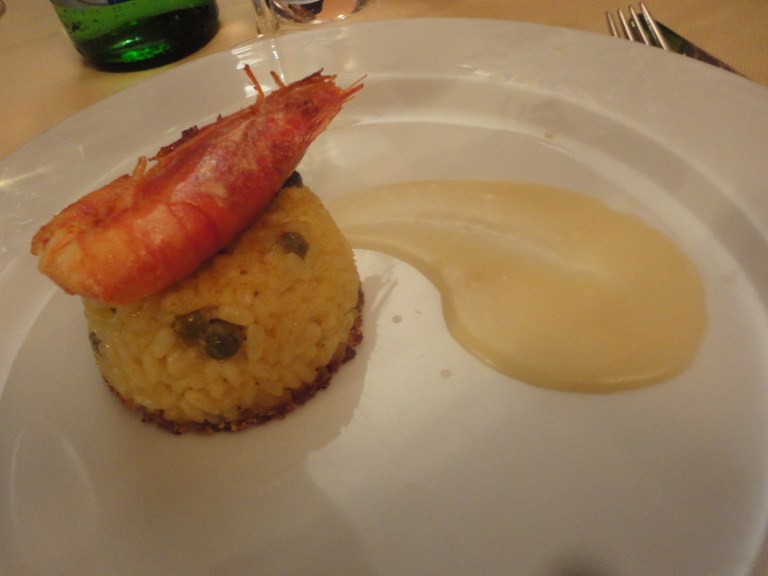 Un filino di olio in meno, non avrebbe guastato… In abbinamento il Ravello Costa d’Amalfi Selva delle Monache 2012 di Ettore Sammarco di cui vi ha già parlato il Pigna qui . Continuiamo con un timballetto di riso con gamberi e piselli servito su vellutata di gamberi.