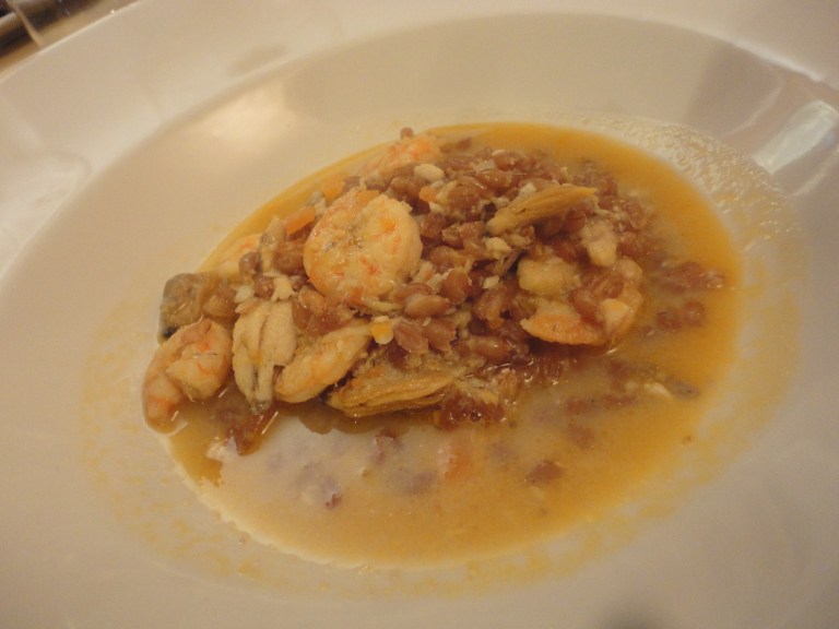 E alla piemontese Sara Cordara, nutrizionista di fama (ma anche di fame ;-)), le vengono i luccichii agli occhi solo a vederle… Proseguiamo con il primo antipasto, una zuppa di farro condita con gamberi, alici fresche e colatura di alici. Succulenta e profumata, con il farro in bell’evidenza anche se un filino tenace. Abbiamo aperto le danze degli abbinamenti con “ il lavoro che mi ero portato da casa”, Fiano di Avellino 2012 Corteioanna di Lapìo.