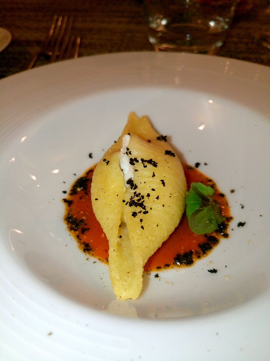 Conchiglione fritto ripieno con ricotta di Agerola su San Marzano e polvere di olive nere. All’origine vi è l’abitudine (non solo cetarese) di ripassare in padella la pasta del giorno prima, da qui questa cottura doppia che arricchisce il sapore.
