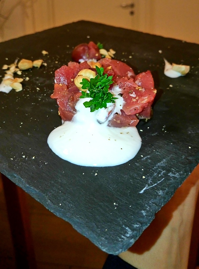 Cetaria – Baronissi, Tartare di tonno su yogurt magro con nocciole di Giffoni e chicchi d’uva