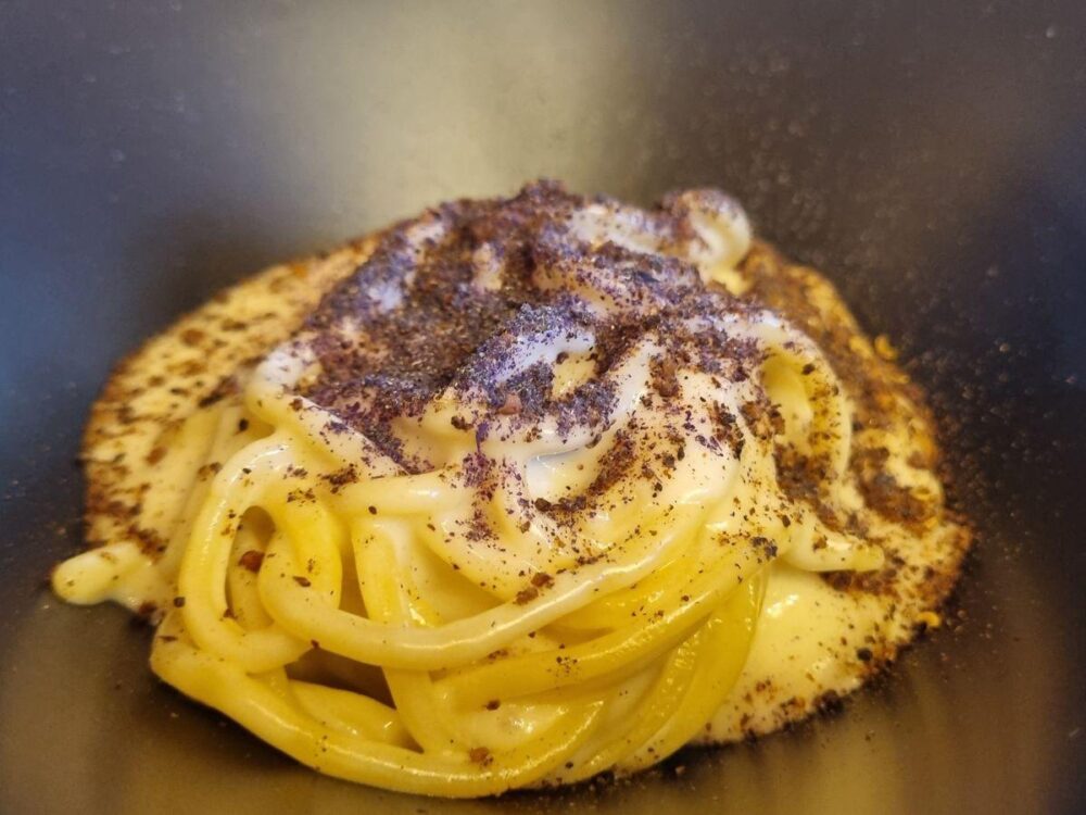 Le lumache con crema di pomodoro confit, polvere di origano, siero di pomodoro e olio all’aglio orsino introducono una struttura più articolata, con un equilibrio interessante tra acidità e componente aromatica. Lo spaghetto quadrato fatto in casa alla “cacio e pepe di montagna” con polvere di malva è uno dei passaggi più centrati: una rilettura territoriale che funziona per equilibrio e coerenza.