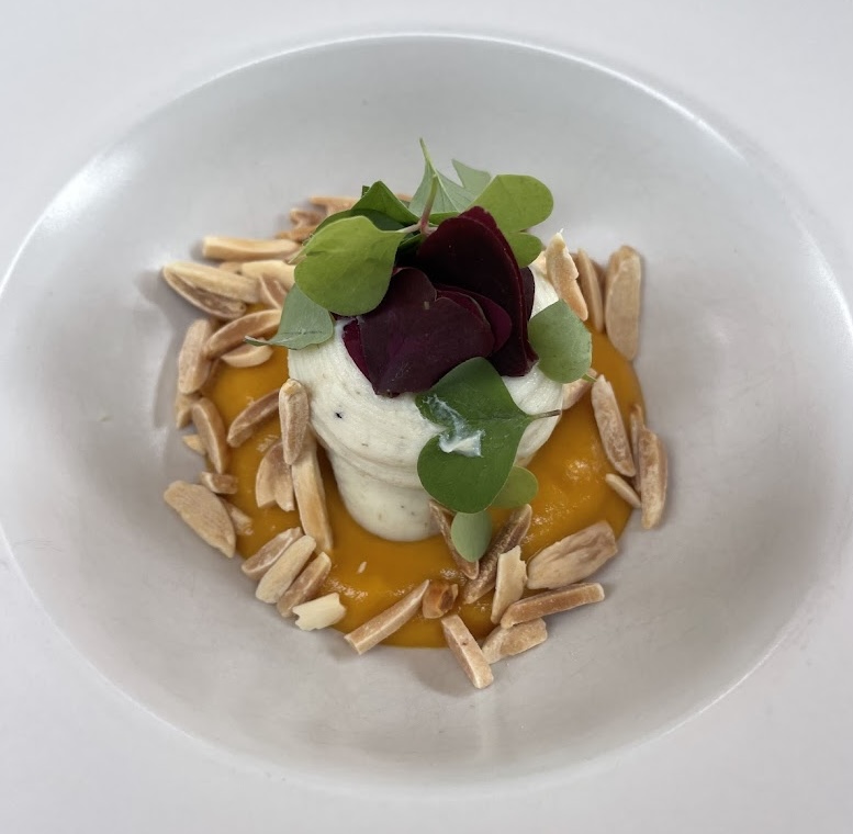 Il menù degustazione dello Chalet rappresenta la sintesi più completa di questo pensiero. Si apre con una rapa rossa lavorata sulla sua terra, accompagnata da emulsione di mandorla e fondo vegetale: un piatto che gioca sulla profondità e sulla pulizia, dove la dolcezza naturale viene gestita con precisione.