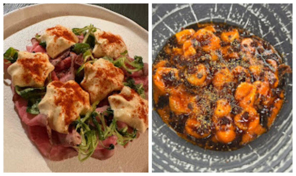L’agnolotto di lepre con il suo sugo al cioccolato, mirtillo nero fermentato e semi di cappero rappresenta invece il lato più sperimentale della cucina, con un gioco di contrasti che non cerca compromessi. Tra i secondi, il chuck-flat alla griglia con panna caramellata e patate alla bracelavora sulla golosità, mentre il magret di anatra Mullard con mirtillo rosso e broccolo fiolaro e il piccione in due cotture con pak-choi e sambucomostrano una maggiore profondità tecnica.