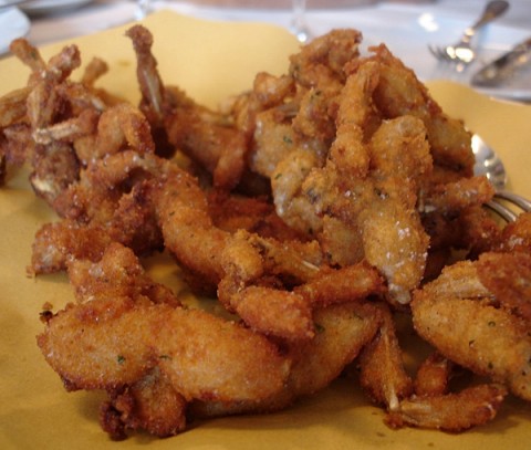 A tavola, via da sotto il naso i cetrioli e avanti su una mezza forma di parmigiano fatto a pezzi e sbranato in poche decine di minuti. Due fette di salame ? Ma si, anche noi come Bigazzi non stiamo qui a sottilizzare tra un Felino ed un maiale. A spasso per il nord con le rane fritte di Vercelli panate come una Milanese e poi una paranza che mi ha inseguito dalla Riviera…