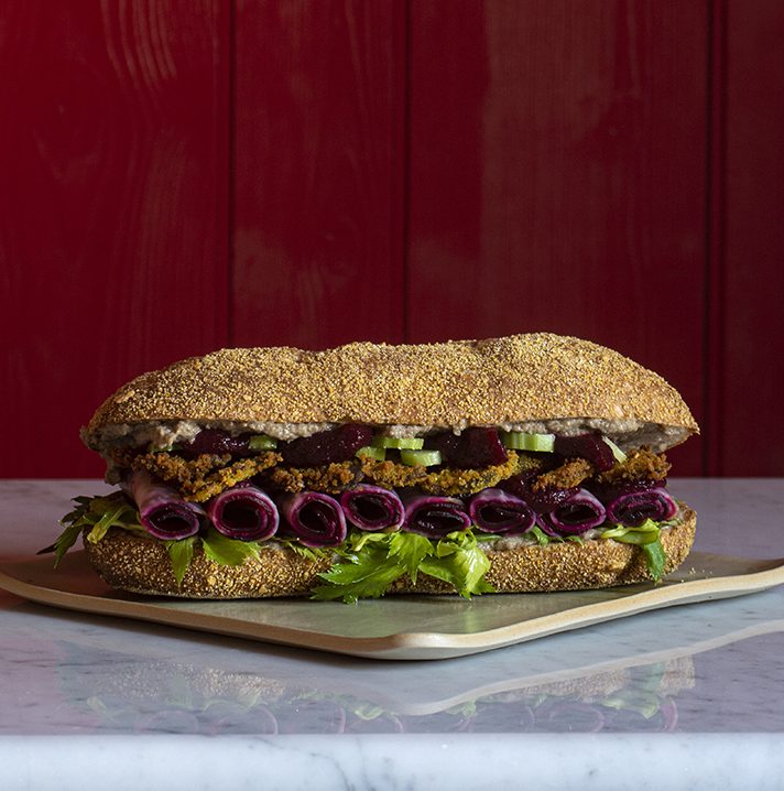 Il panino è stato creato per mettere in risalto i Funghi trifolati champignon Logrò, esaltandoli in una salsa con lenticchie speziata e con un’impanatura vegetale. In aggiunta il sedano di Rubbio, il sedano rapa e la rapa rossa cotti al cartoccio. Il pane, senza lievito aggiunto, è stato realizzato con farine di grano italiano e fermentazione spontanea a base di kombucha.