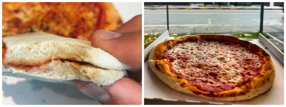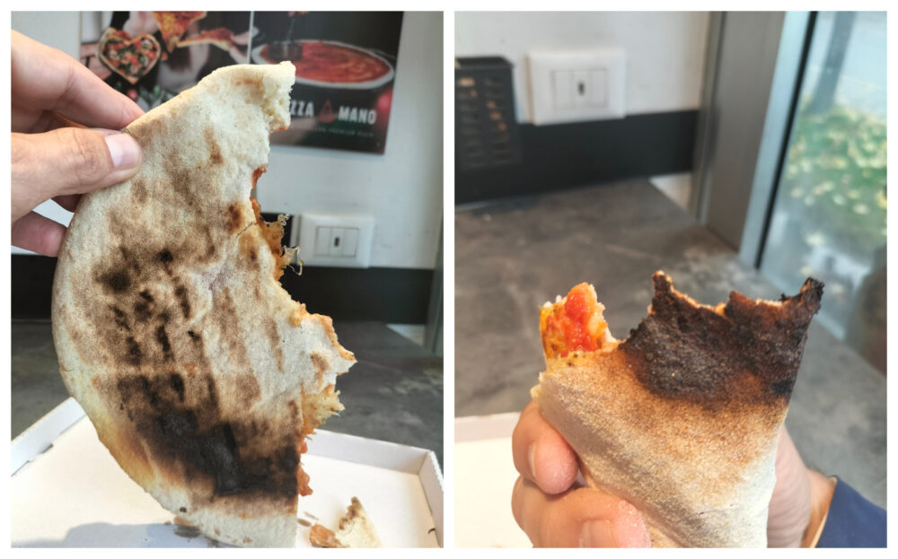 L’impasto? Surgelato e cotto in 4 minuti, pratica rischiosa… Infatti risulta leggermente crudo ai bordi e rovente, anzi bruciacchiato, al centro. Alzo la pizza e guardo la base: i segni di bruciatura sono evidenti.