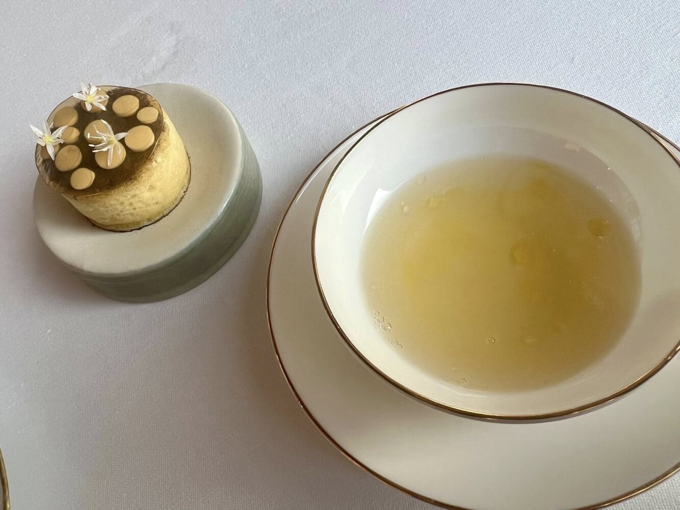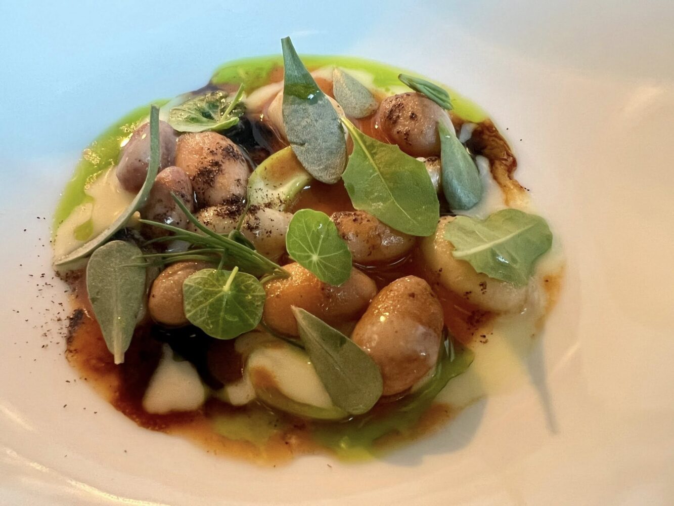 Gli gnocchi di Godia sono omaggiati in accompagnamento a un brodo di mare e ostrica, con un battuto di “garusoli” (murici) e anche qui ci troviamo innanzi a un signor piatto.