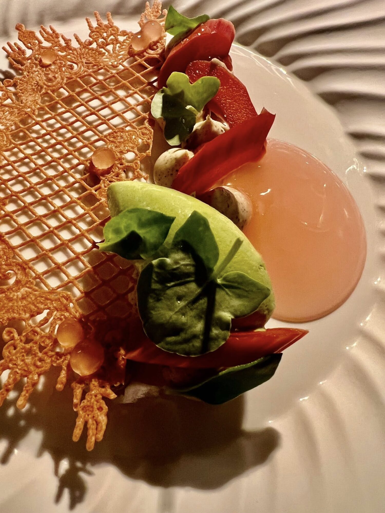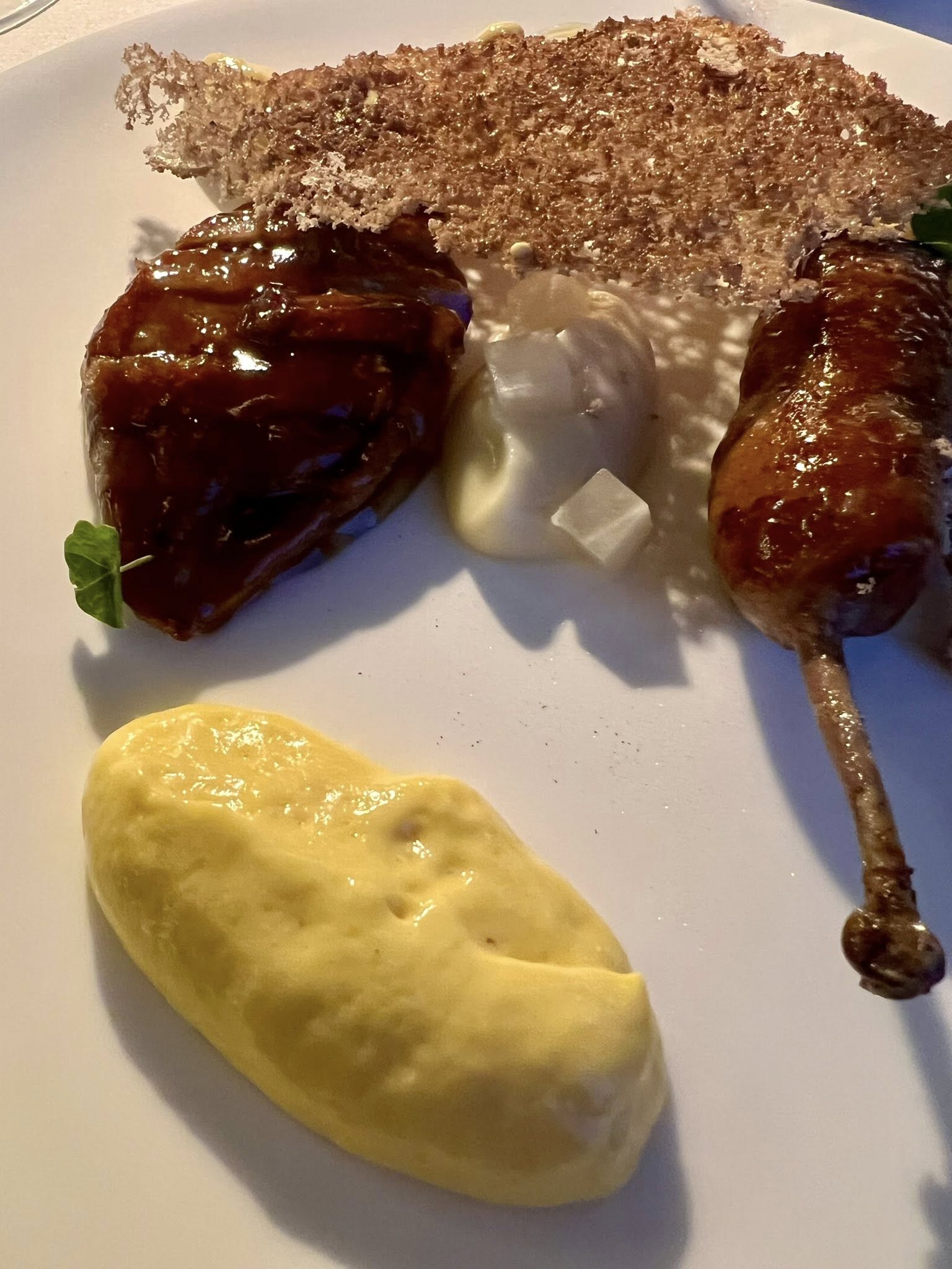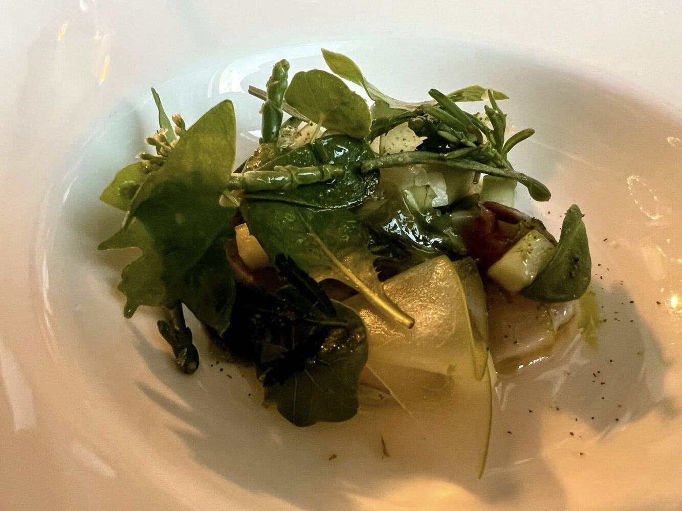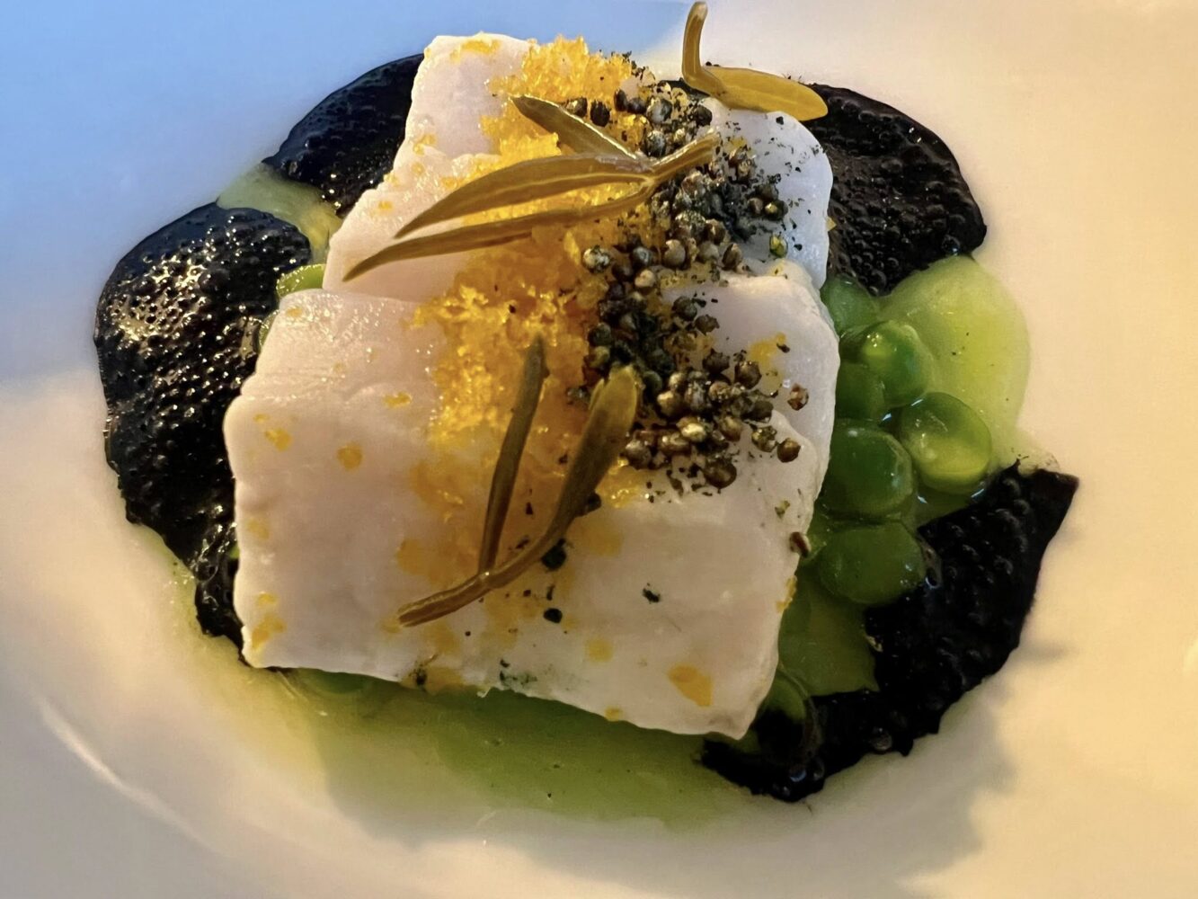L’incipit di sole alghe e lattuga di mare ghiacciata mette a fuoco perfettamente il territorio. Seguono fagioli (pura tradizione friulana) ed erbe dell’orto, con piccole sfere che esplodono di grandissima concentrazione del vegetale. Eccellenti.