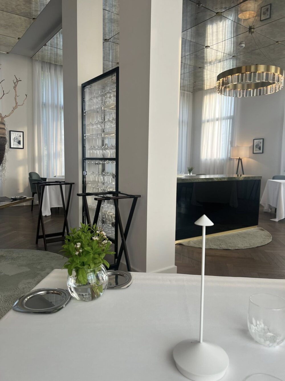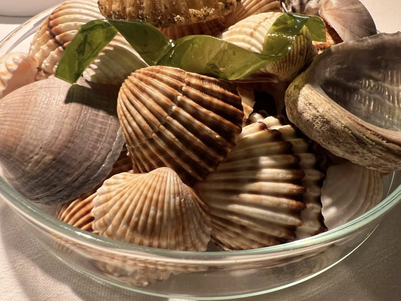 L’aperitivo viene servito all’esterno come Agli Amici, con una selezione di bollicine e di champagne studiata apposta con riferimento al luogo. Tra gli amuse-bouche, un granchio blu servito sopra al suo carapace dipinto proprio di..blu, mentre Agli Amici è dipinto d’oro. Comunque, un chiaro messaggio alla filosofia no-waste di cui si parla ormai da tempo. Lo scenario è magnifico, con vista sul giardino e la laguna a due passi.
