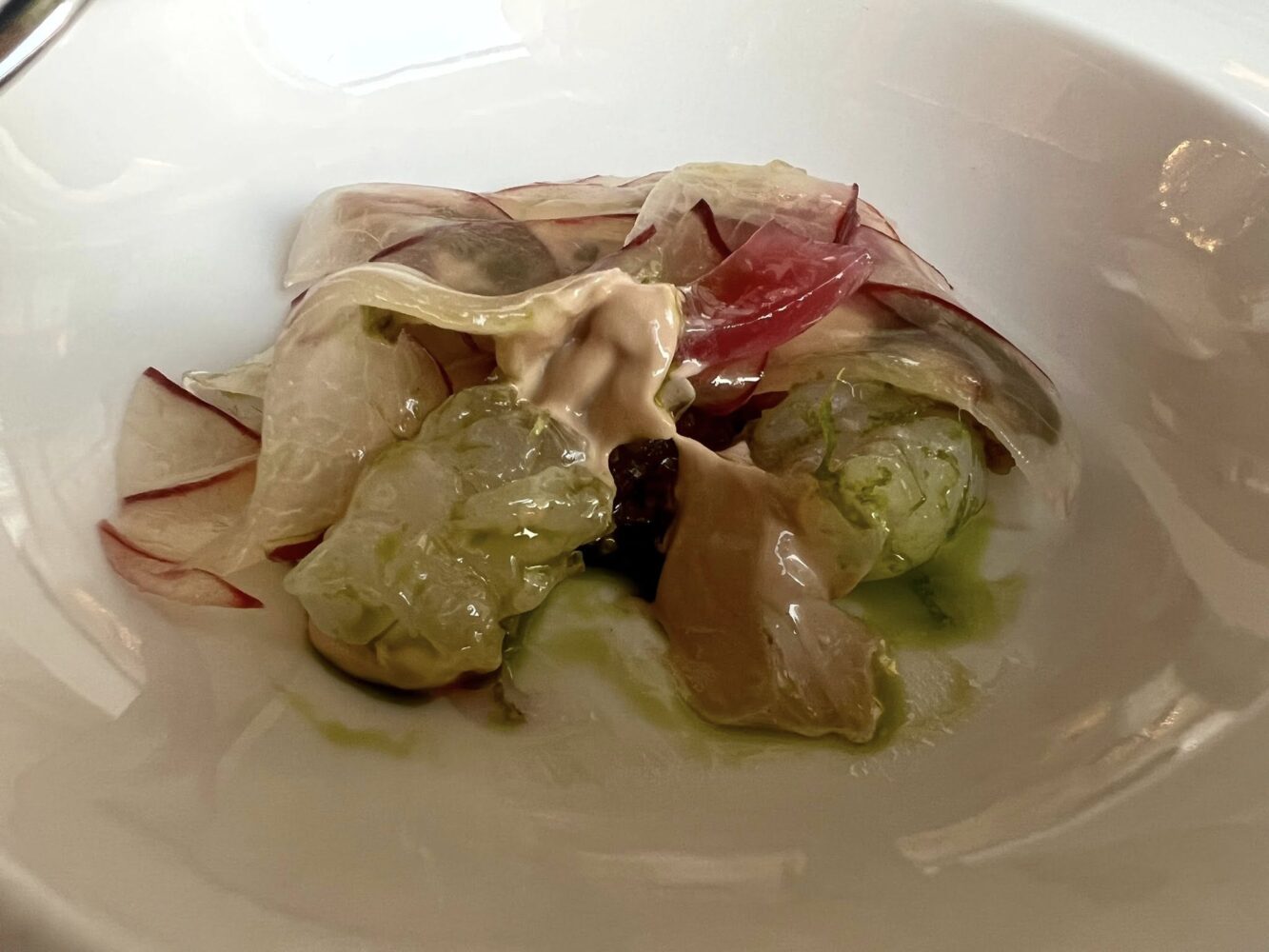 Ancora, mazzancolle con fiori dell’orto, latte fermentato e cren, anch’esso elemento irrinuciabile nella cucina friulana.