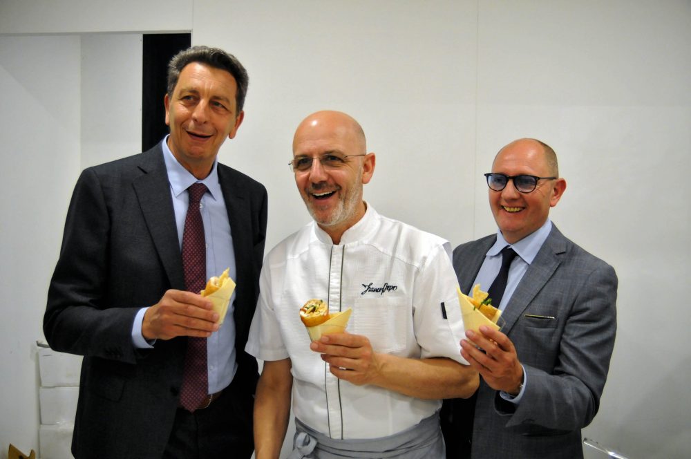 Per l’occasione Pepe ha presentato in anteprima “Colpo Doppio”, la sua ultima creazione, che è anche un omaggio alla città di Parma: un cono fritto che reinterpreta la Parmigiana di melanzane ed è composto da una fonduta di mozzarella di bufala campana Dop affumicata, chips di Grana Padano Dop e una parmigiana in crema con riduzione di basilico.