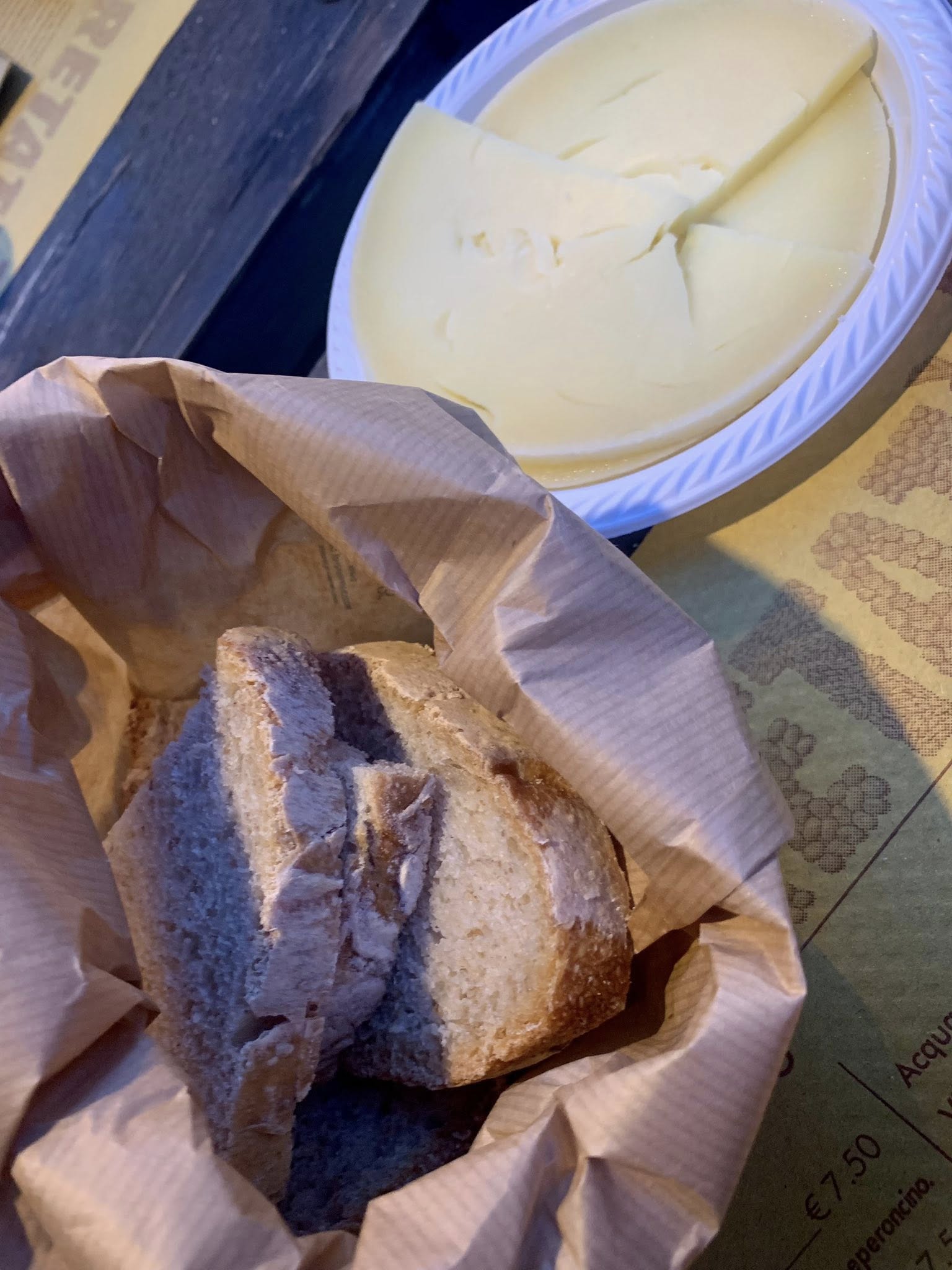 - Una volta al tavolo, uno dei ragazzi dello staff viene a prendere l’ordinazione: il menù, semplice ed immediato, così come i vini, sono riportati sulla tovaglietta in carta riciclata: 7 piatti (dai 4 euro e 50 ai 5 euro) e tre tipi di dolci.
