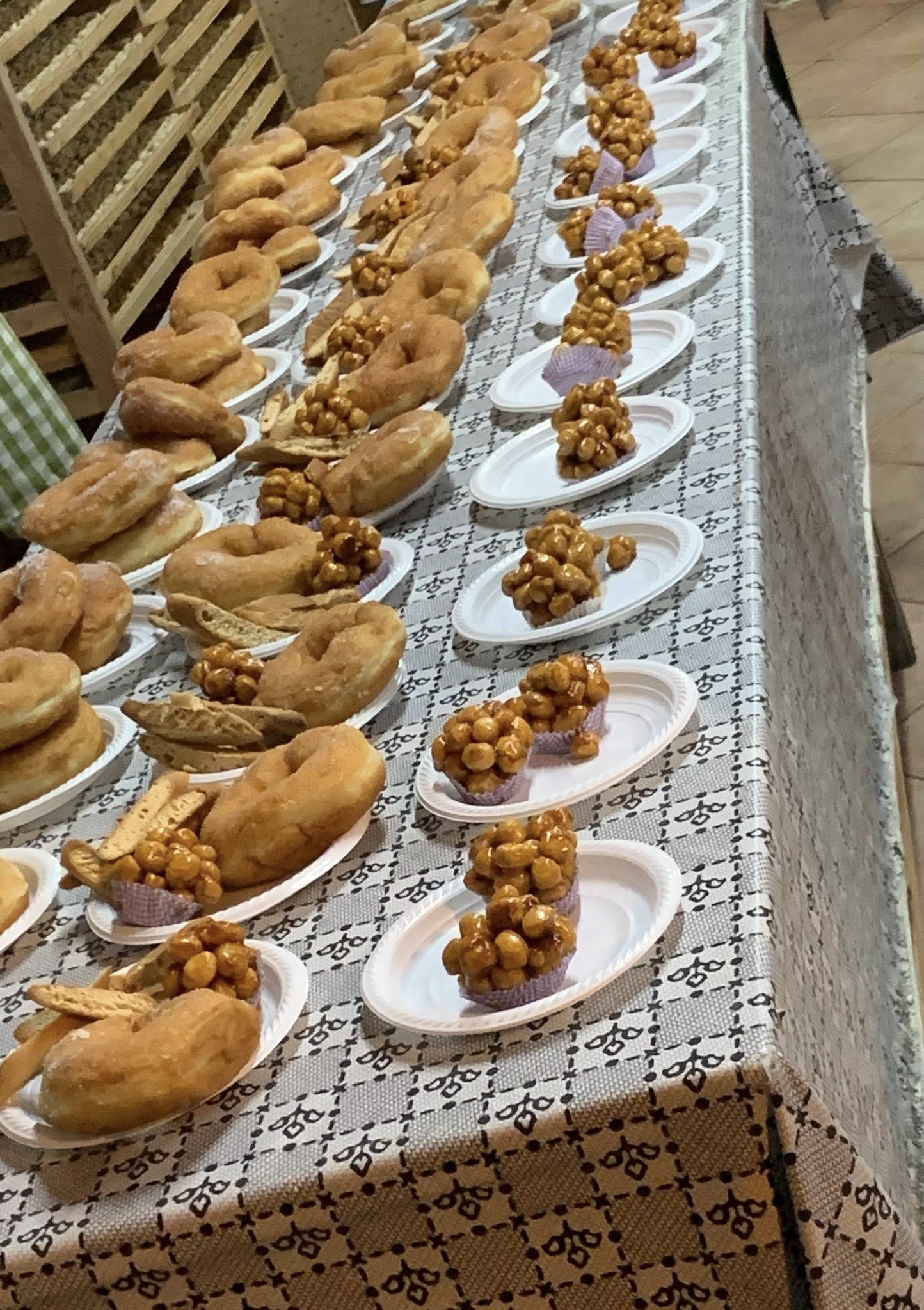 - Le cucine si trovano in un enorme locale rivestito di legno, e sono aperte e visitabili: lo spettacolo delle signore che cucinano e assemblano i piatti (12 soltanto per fare i cavatielli, dalle 7 di mattina alle 17:00 e molte sono le stesse da 25 anni, ci racconta Claudio D’Ambrosio) non ha prezzo. Le norme igieniche e di sicurezza, tutte rispettate, nulla possono sulla spontaneità dei loro visi e dei loro sorrisi. Una festa nella festa.